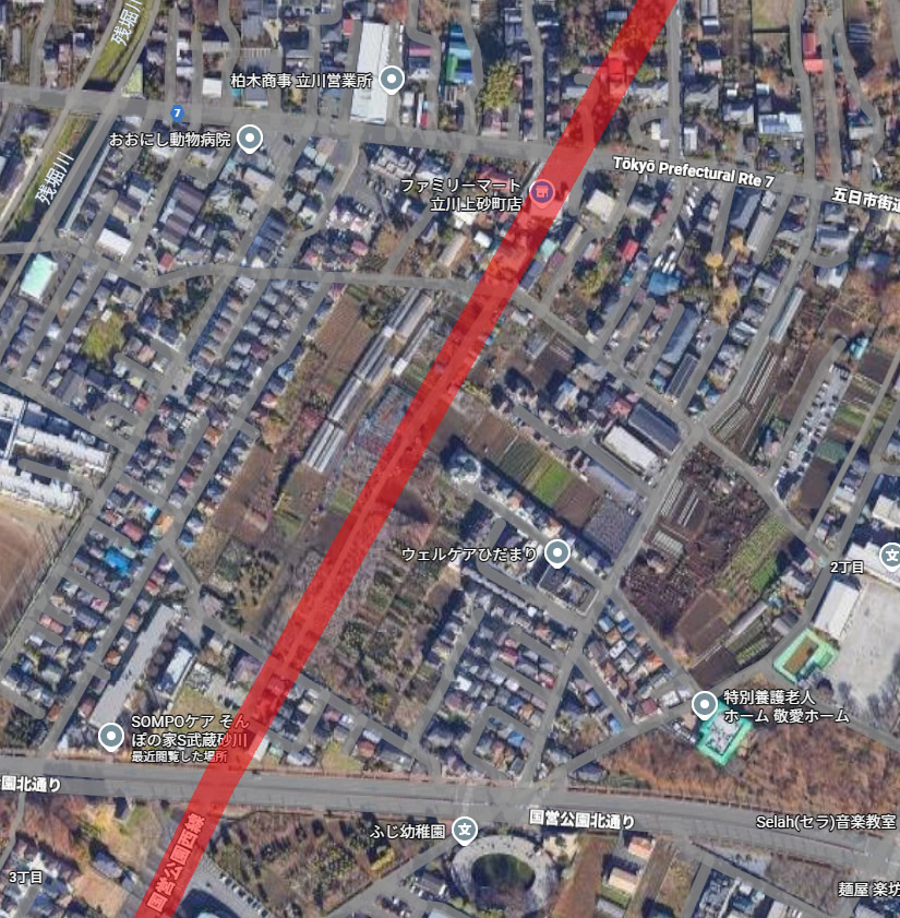 公園北通りの北側は、計画道路を踏まえてなのか建物は少なく、ほとんどが畑になっている。五日市街道にはファミリーマート立川上砂町店の場所で接道する計画となっている。