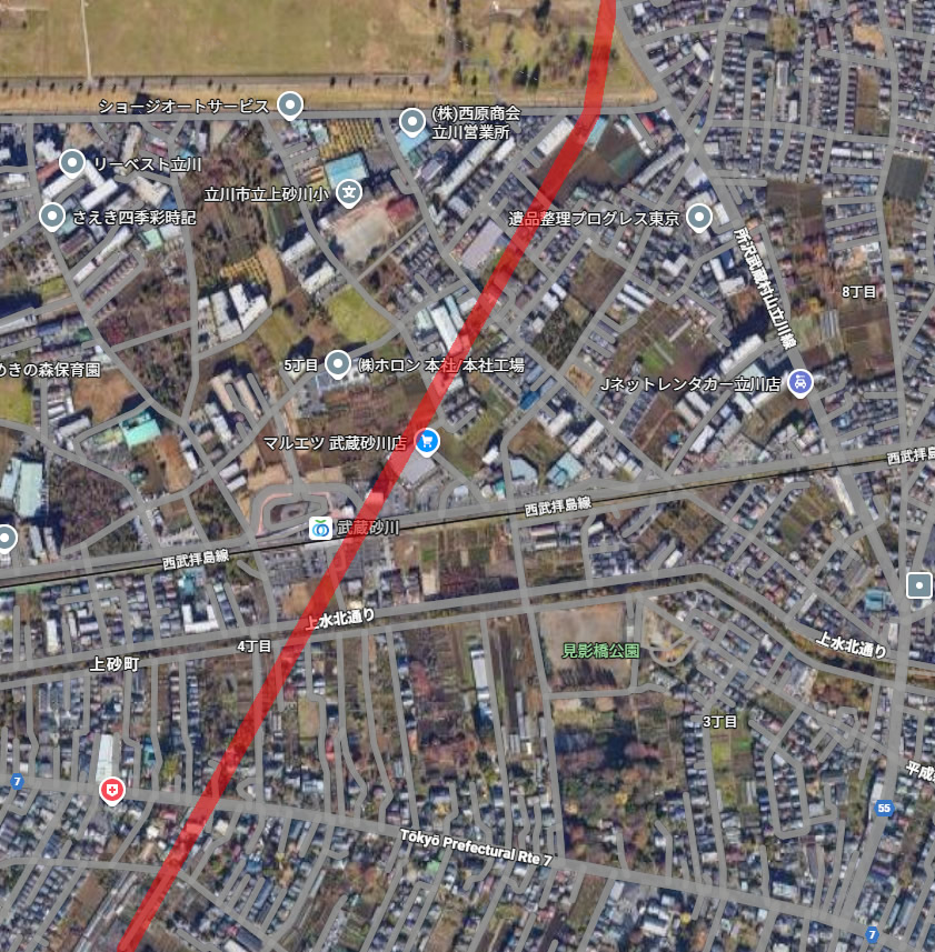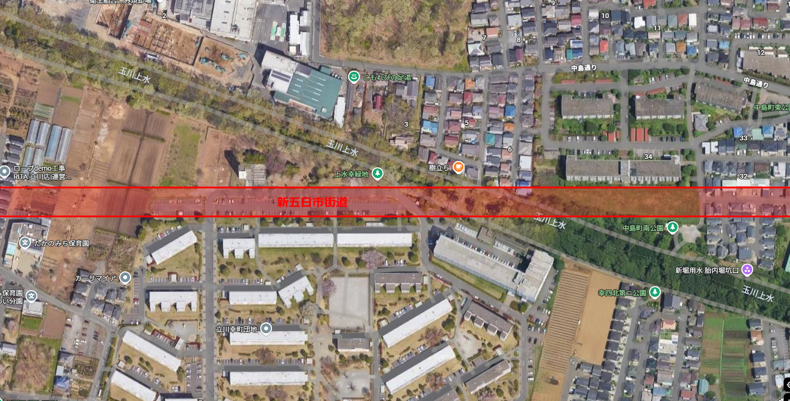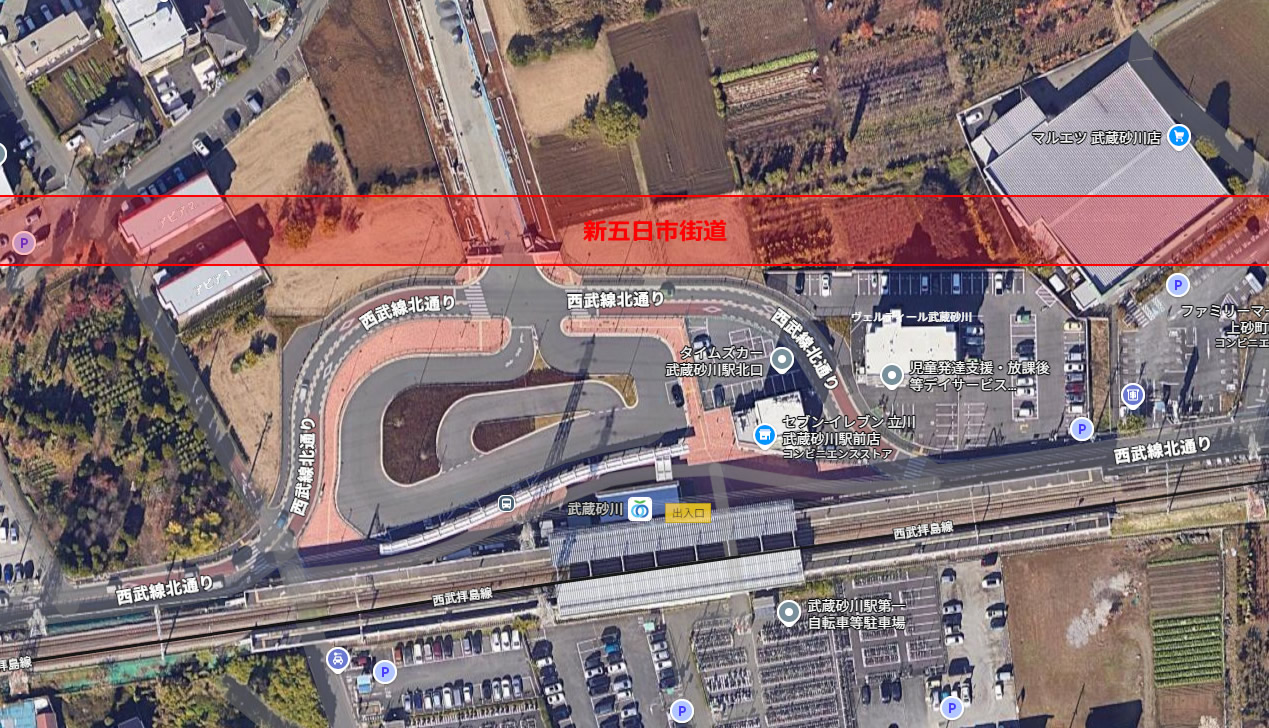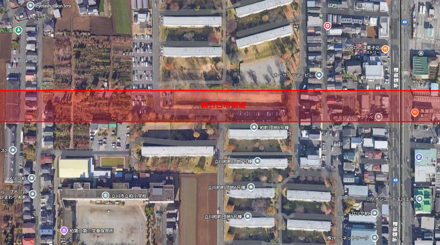 立川市の北側、砂川には五日市街道を軸に北側に平成新道、南側にすずかけ通り~公園北通り、3本の通りが存在する。そして平成新道のさらに北側に「新五日市街道」という計画道路があります。