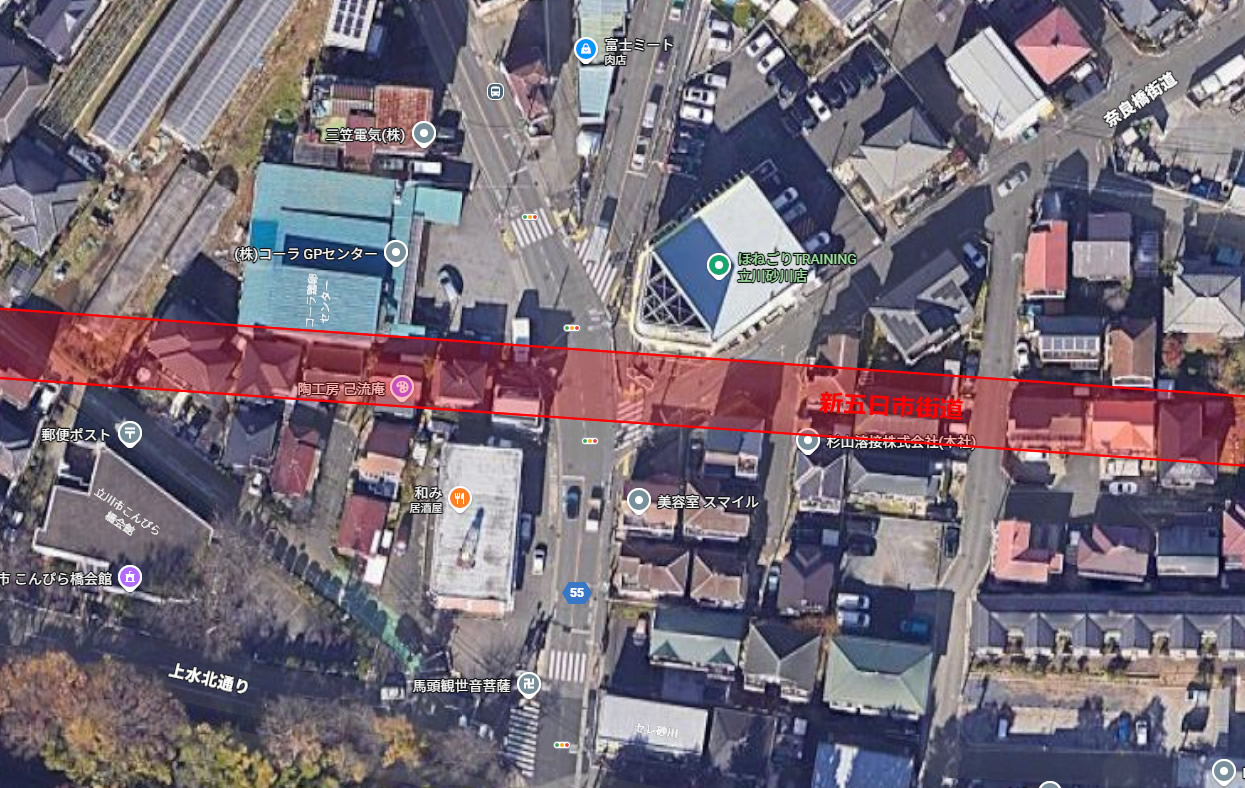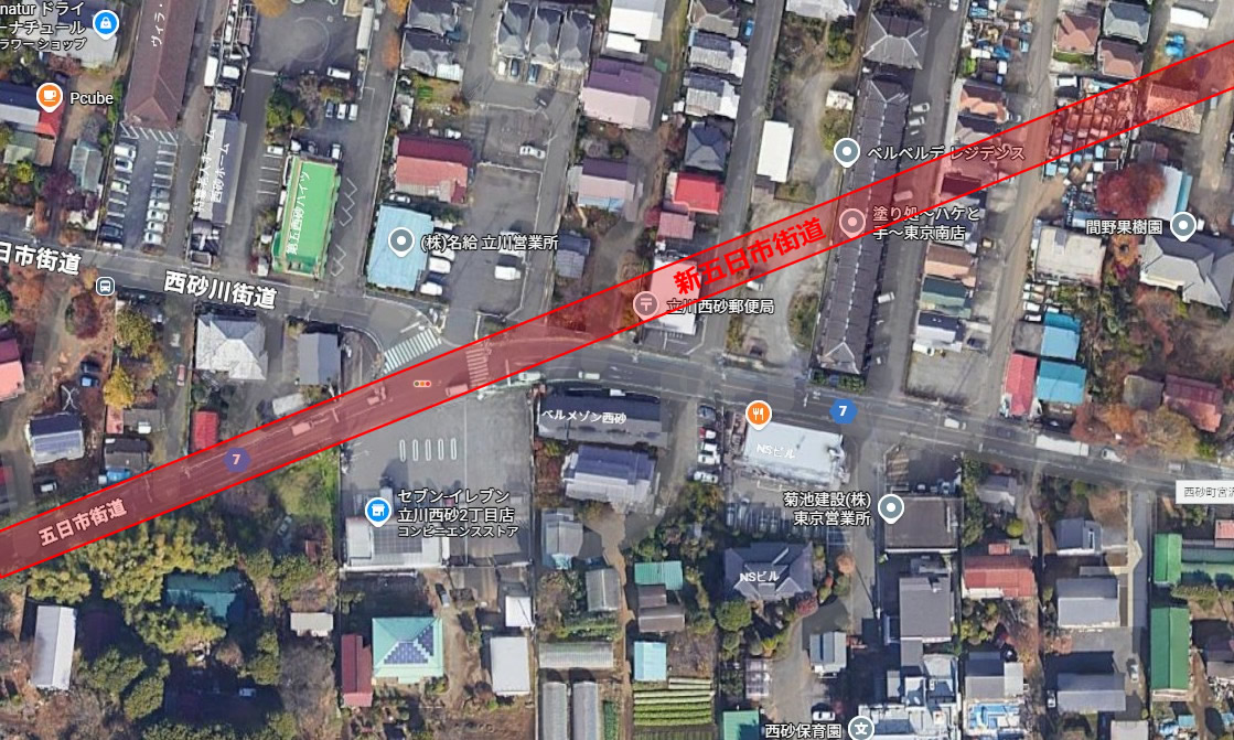 東京都立川市北部・砂川地域には、既存の五日市街道の北側に 都市計画道路「新五日市街道」 の用地が設定されている。これは五日市街道のバイパス的な東西幹線道路として位置づけられており、東京都の第四次事業化計画に含まれている長年の道路整備計画である。