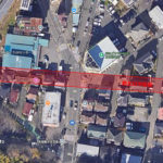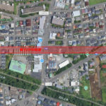 大山郵便局もある大山商店街、商店街の建物も立ち退きが進んでいることが分かる。その北には、元々あった公園西線を拡幅する用地がすでに確保されているようです。
