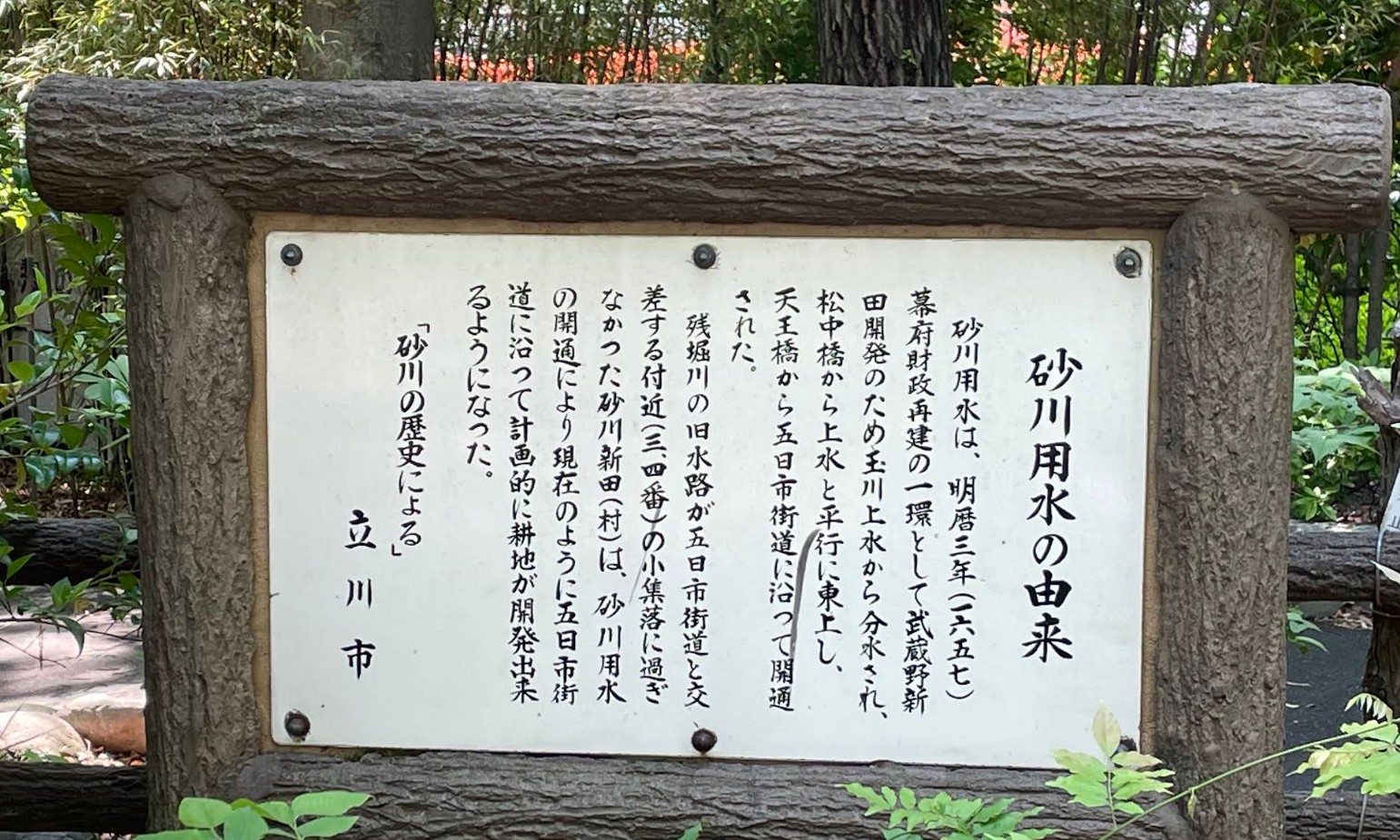 砂川用水は、江戸時代初期の1657年に玉川上水から分水された歴史ある用水路で、立川市と昭島市の境にある松中橋付近で取水され、西へ流れた後、五日市街道沿いに東進したという。