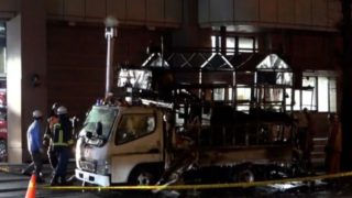 福岡県の道路で「車が燃えながら走っている」との通報が相次いだ。車は焼損し、現場の路上には焼け焦げたイモのような物が多数散乱していた。警察と消防が事故原因を調べている。