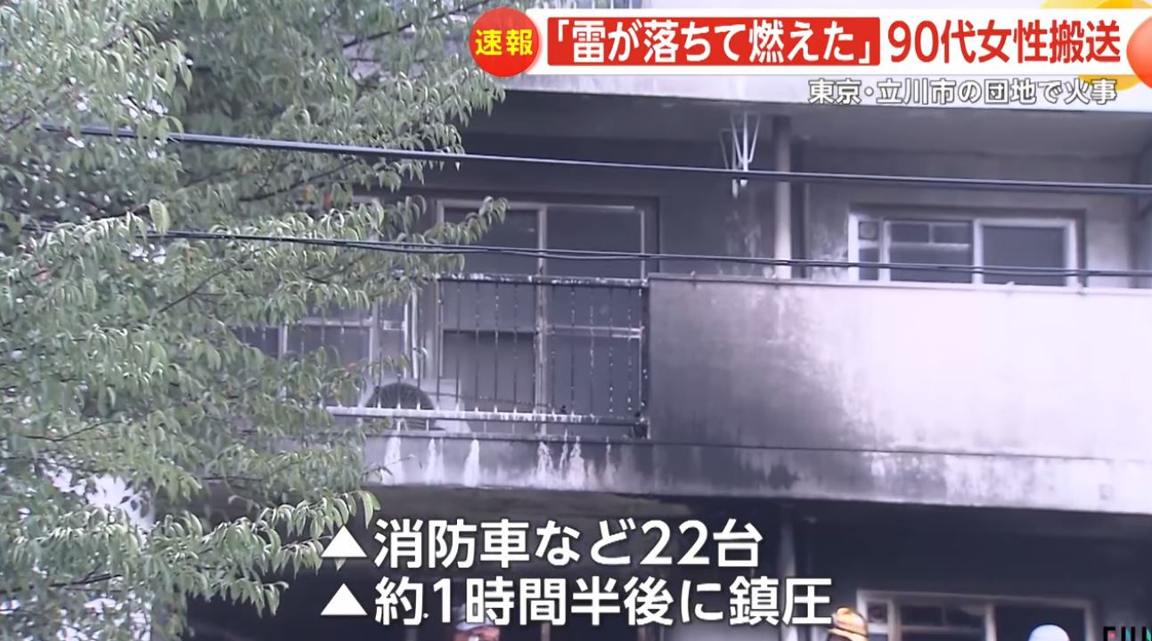 東京・立川市若葉町の若葉町団地で落雷による火災が発生、住人の86歳の女性が搬送された。