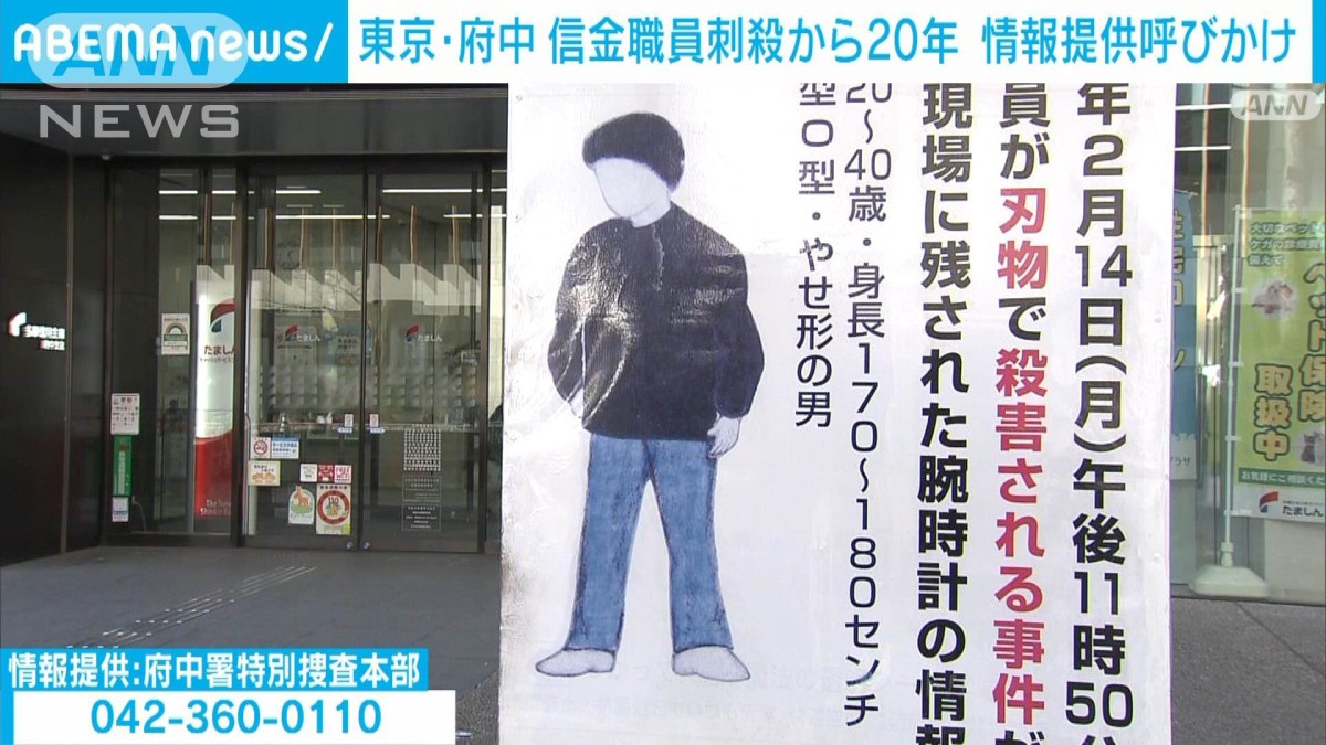 東京・府中市の信用金庫で当時39歳の男性職員が殺害された事件が未解決のまま20年経つのを前に、遺族らが情報の提供を呼び掛けました。 2005年2月14日、多摩信用金庫・府中支店で、帰宅しようとした後藤博樹さんが、男に刃物で刺され死亡しました...