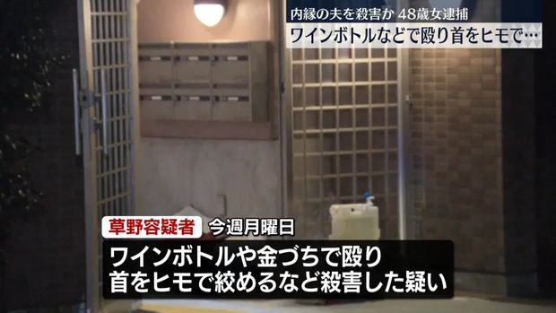 警察によると、草野容疑者は同日未明、自宅アパート内で同居する内縁の夫・今熊秀則さん(52)の頭部をワインボトルや金づちで殴打し、さらに**ビニール紐で首を絞めるなどして殺害した疑いが持たれている。被害者の遺体には顔及び頭部から出血があり、複数の凶器が使われたとみられている。