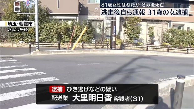 22日夜、埼玉県朝霞市で、80代の女性がひき逃げされその後、死亡した事件で、配送業の31歳の女が逮捕されました。逮捕されたのは、越谷市に住む配送業の大里明日香容疑者(31)です。警察によりますと