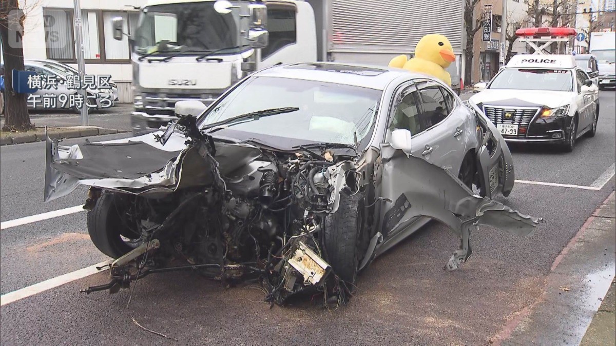 横浜・鶴見区で乗用車が電柱や木に衝突しはずみで対向車線はみ出し衝突 車が大破 対向車線に侵入した運転手は逃走(テレビ朝日系(ANN)) - Yahoo!ニュース