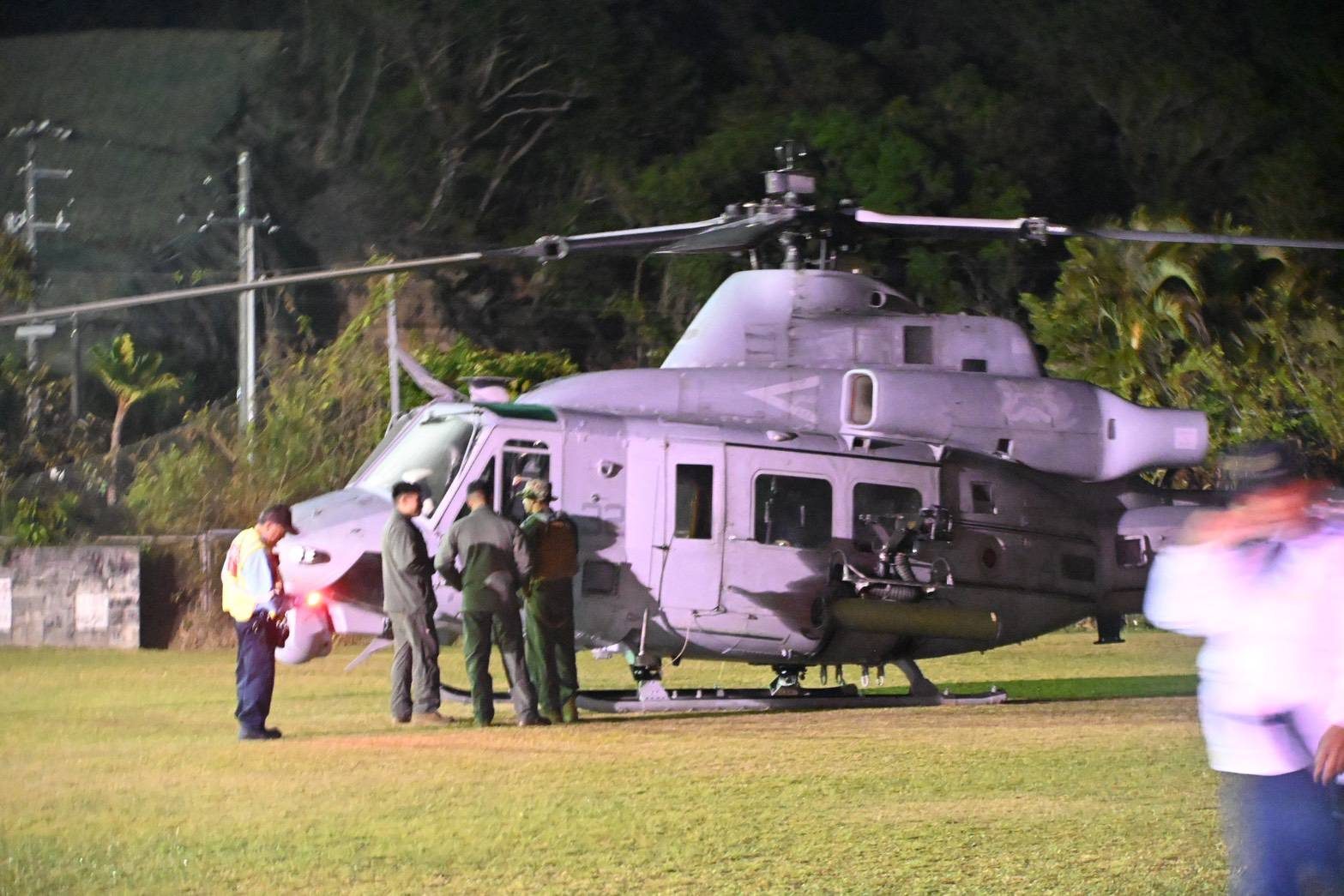 6日夜、名護市の許田区公民館隣の野球場に米軍のUH1ヘリコプターが不時着しているのを本紙記者が確認した。米軍機の所属は不明。球場近くには住宅もあり、ヘリが降りてくるとき、少年野球チームが練習中だった