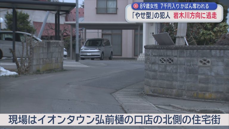 2026年3月26日午後0時55分ごろから午後1時ごろにかけて、青森県弘前市樋の口の路上で強盗事件が発生した。歩いていた89歳の女性が、やせ型の人物に黒色の物体を首筋に当てられ、現金約7000円が入った手提げかばんを奪われた。女性にけがはなかった。