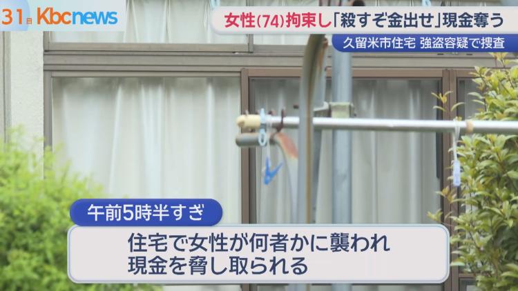 31日早朝、福岡県久留米市の住宅で高齢の女性が拘束され現金を奪われました。犯人は逃走中で警察が強盗容疑で行方を追っています。警察によりますと31日午前5時半ごろ、久留米市京町の住宅で住人の74歳の女性が突然何者かに襲われ、拘束されました。女...